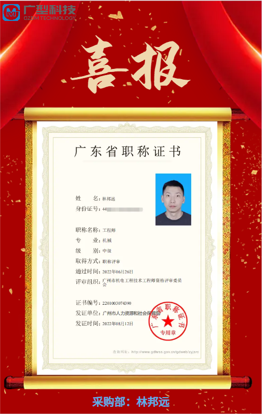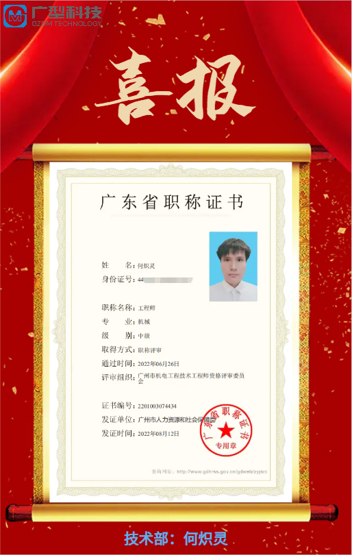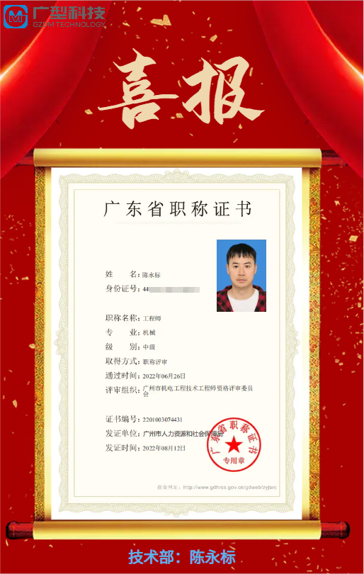 恭喜:廣州市型腔模具制造有限公司三名員工在2022年喜提“中級職稱證書”!