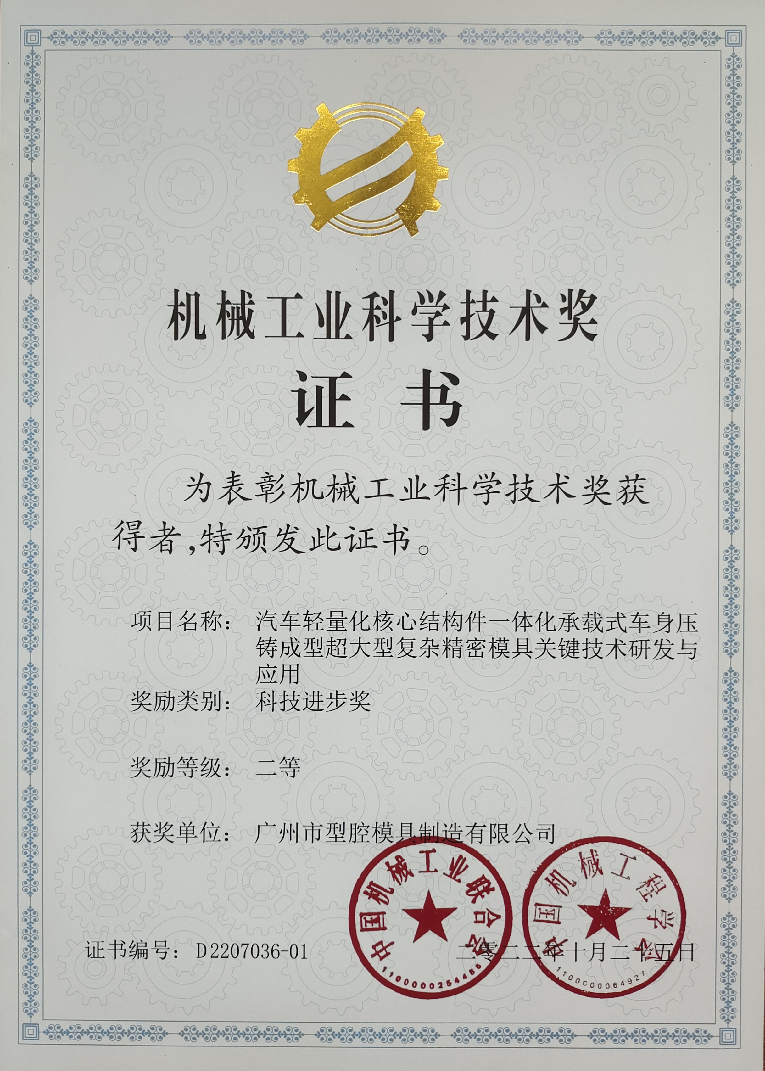 2022年10月20日,中國機械工業(yè)聯(lián)合會發(fā)布了《關于表彰2022年度機械工業(yè)科學技術獎獎勵項目的通報》,其中,我司獨立申報的“汽車輕量化核心結構件一體化承載式車身壓鑄成型超大型復雜精密模具關鍵技術研發(fā)與應用”項目榮獲機械工業(yè)科學技術進步獎二等獎(證書編號:D2207036-01 )。